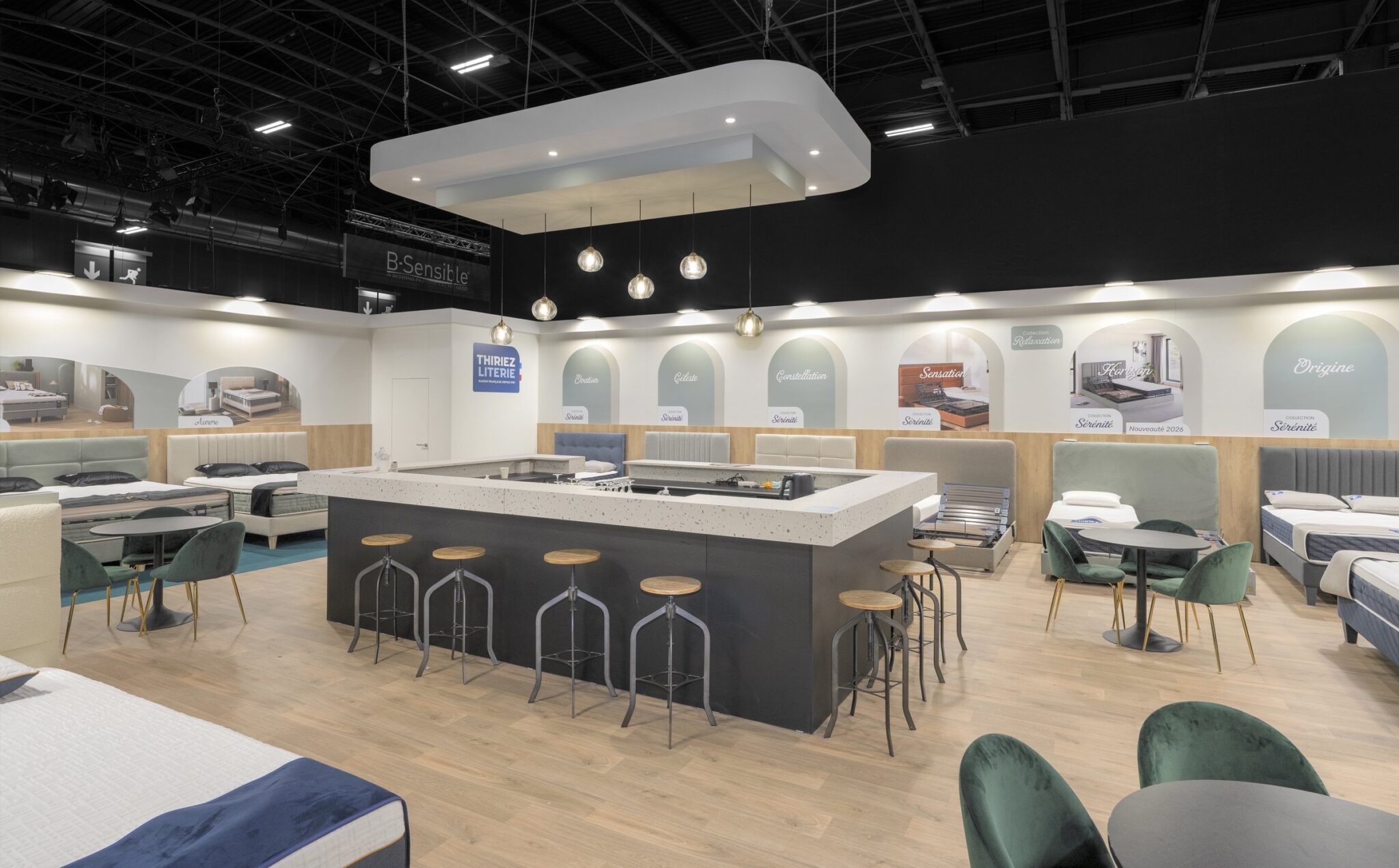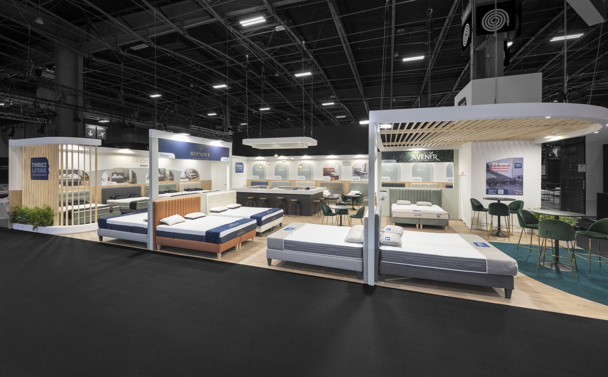 For the latest edition of the Esprit Meuble trade show, R2 Stand & Event has created a 204 m² stand for Thiriez Literie, combining maximum visibility, an inviting design, and an optimized visitor experience. Designed to be seen from all distances, the stand plays on several levels of communication: illuminated signage for identification from a distance, focus on product ranges at medium distance, and graphic messages and logos on partitions for proximity to visitors.
