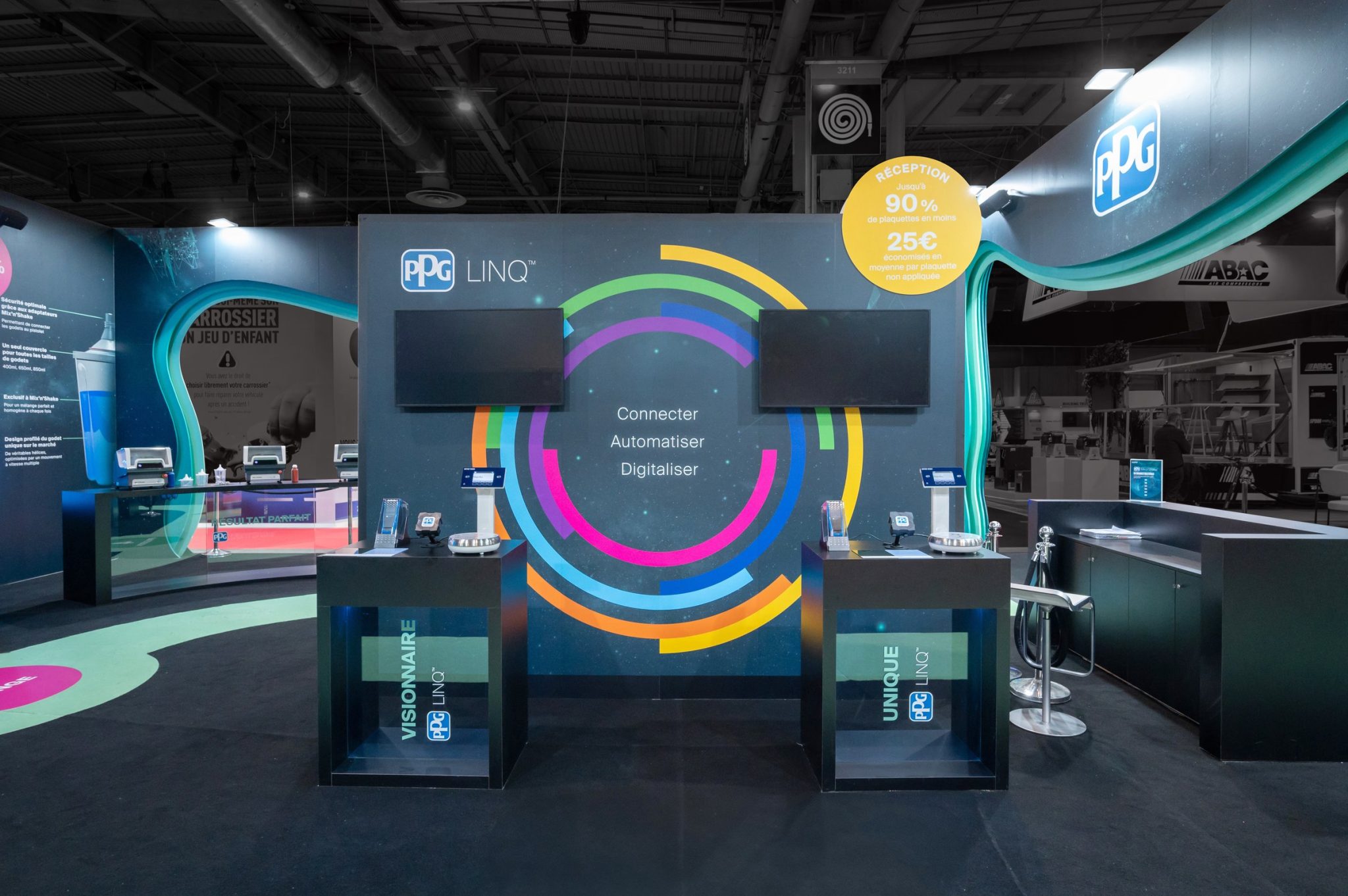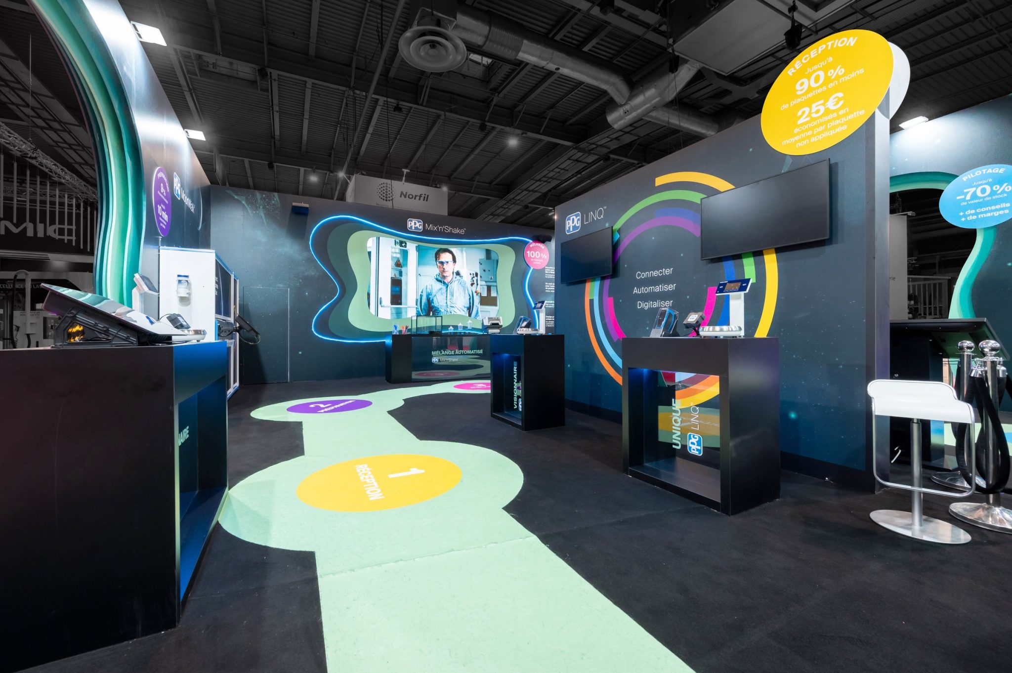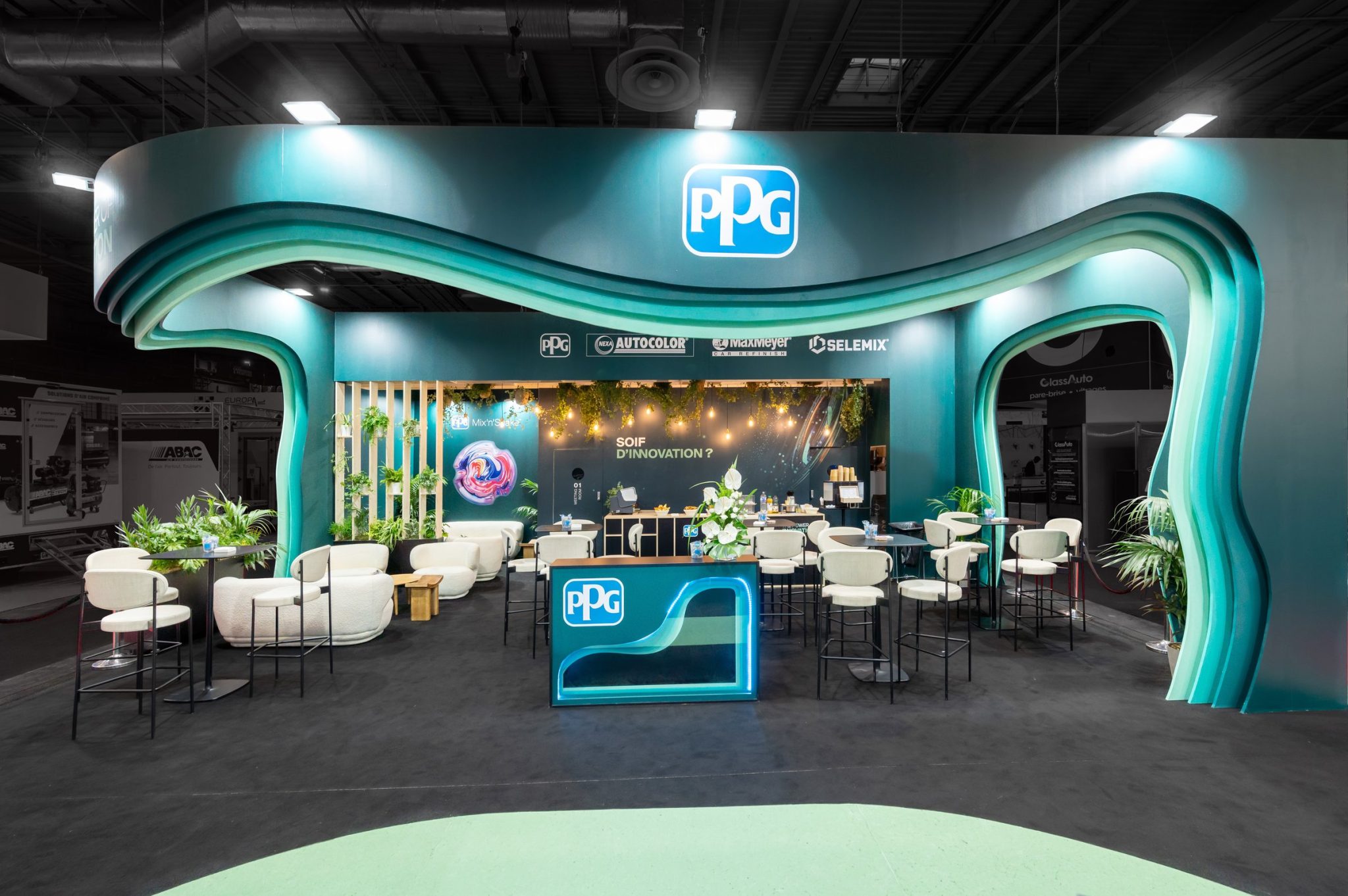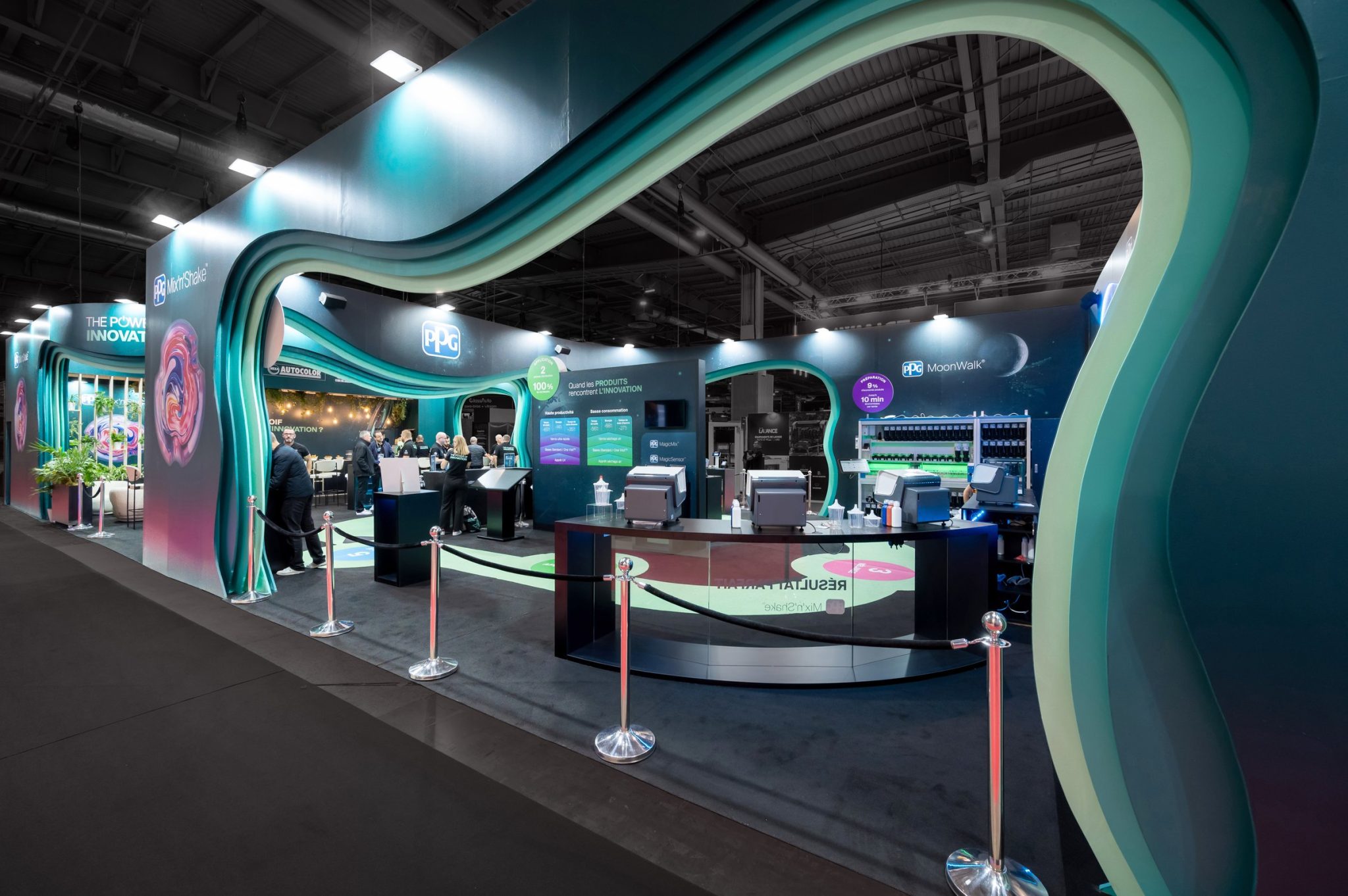 For the Equip Auto trade show, R2 Stand & Event designed and built a custom-made booth for PPG, a global leader in automotive coatings and solutions. Designed to immerse visitors in the world of PPG, the booth combines a strong visual identity, spectacular architecture, and a fluid, interactive visitor journey.