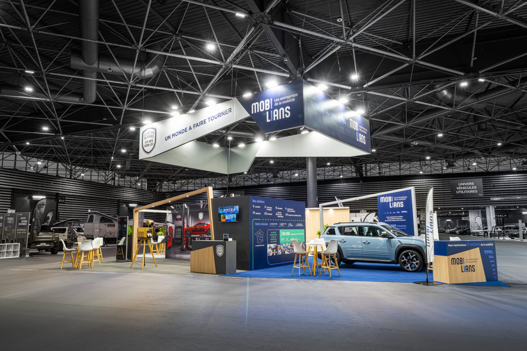 The layout is designed to encourage movement and interaction: an attractive photo opportunity area to attract and engage the public, a discussion area at the back for professional exchanges dedicated to ANFA, and on the Mobilians side, the presentation of a vehicle that concretely illustrates the sector’s expertise and professions.