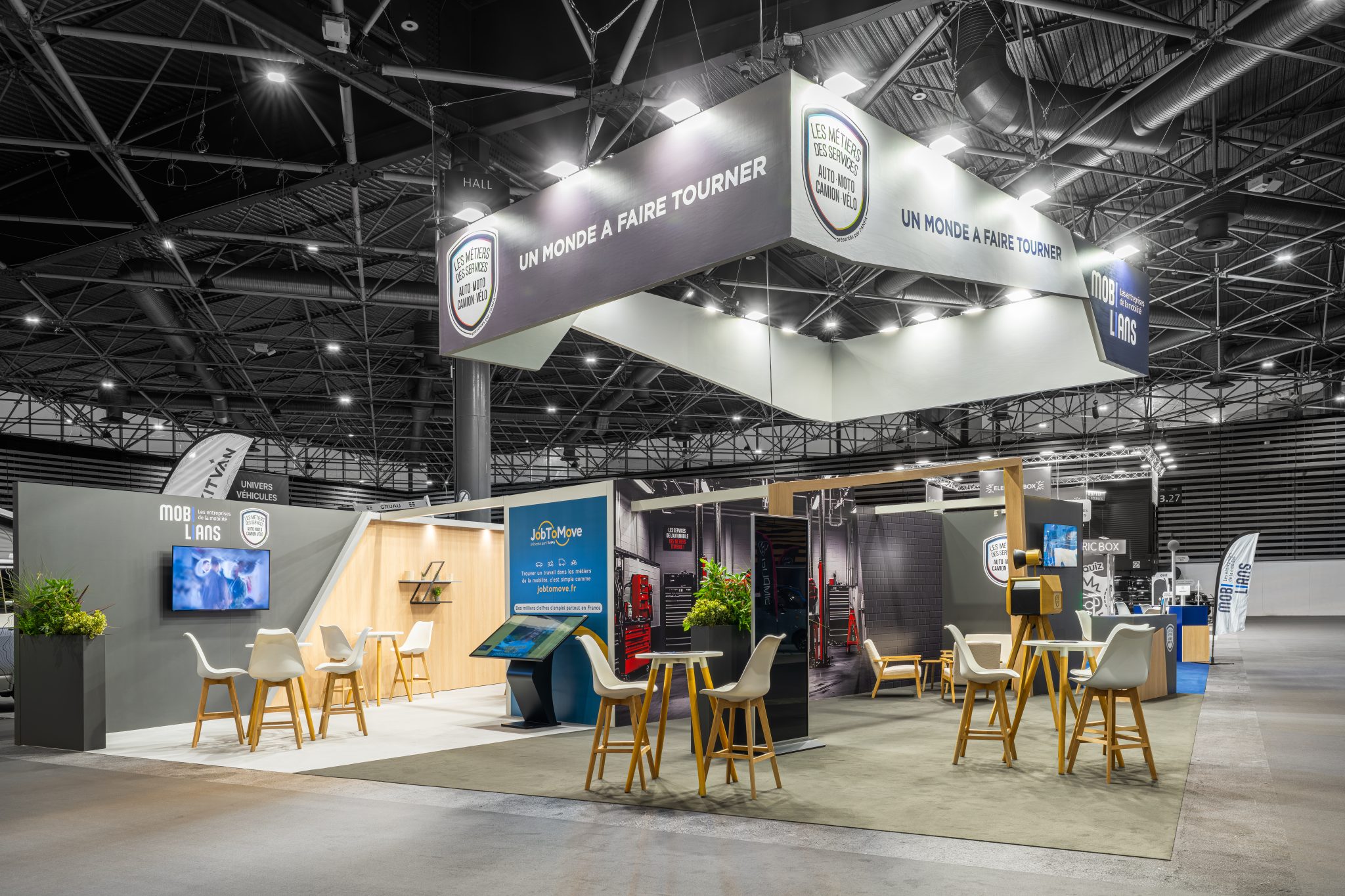 For a new edition of the trade show, R2 Stand & Event has created a custom-made booth for Mobilians and ANFA. This bright and very open booth catches the eye as soon as you enter the hall thanks to its large suspended sign, visible from a distance, which makes a strong and recognizable statement.