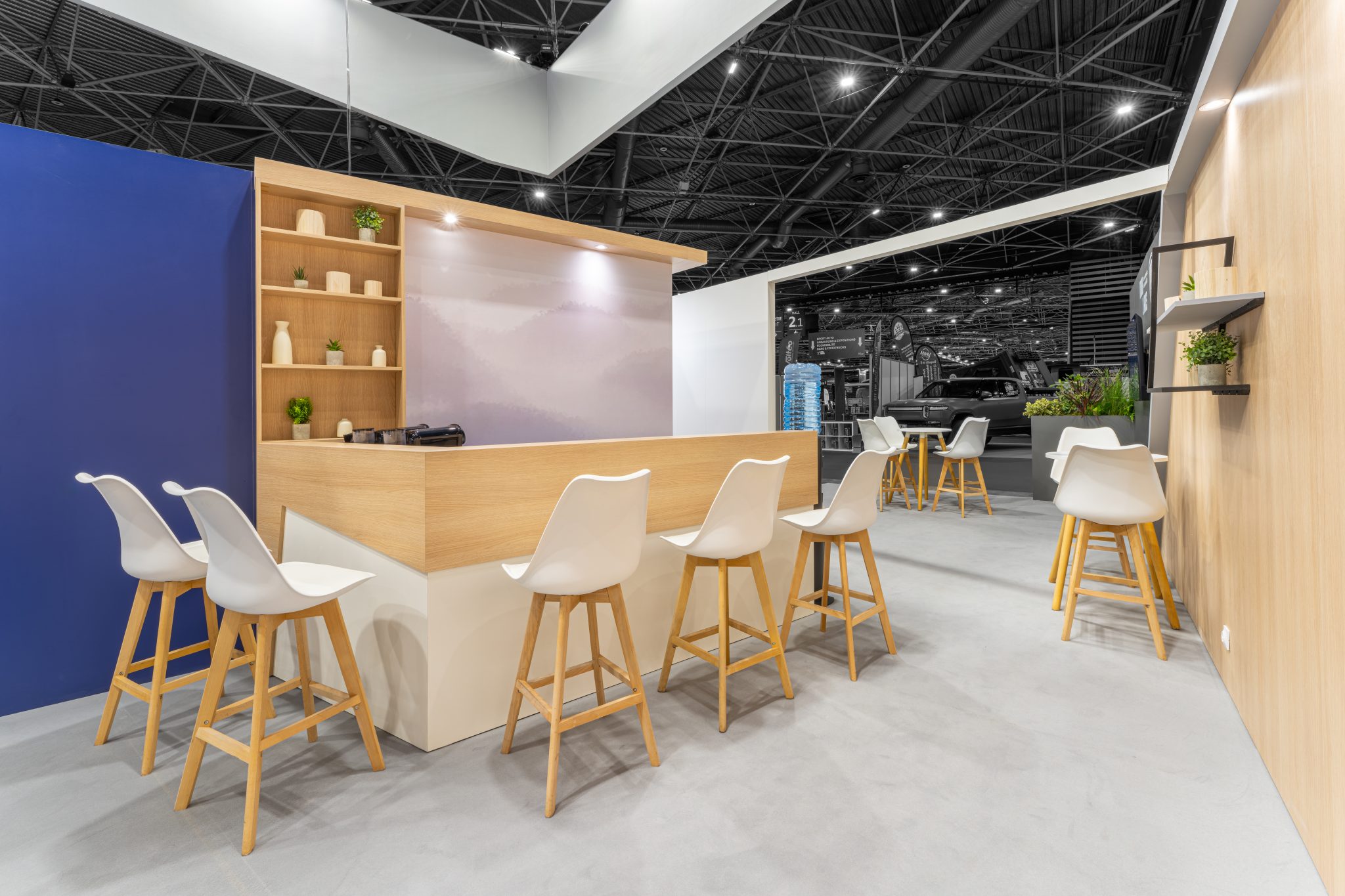 The overall effect creates a modern, welcoming, and coherent universe, where every detail—from the materials to the visuals—reinforces the message of proximity and expertise conveyed by the two exhibitors.