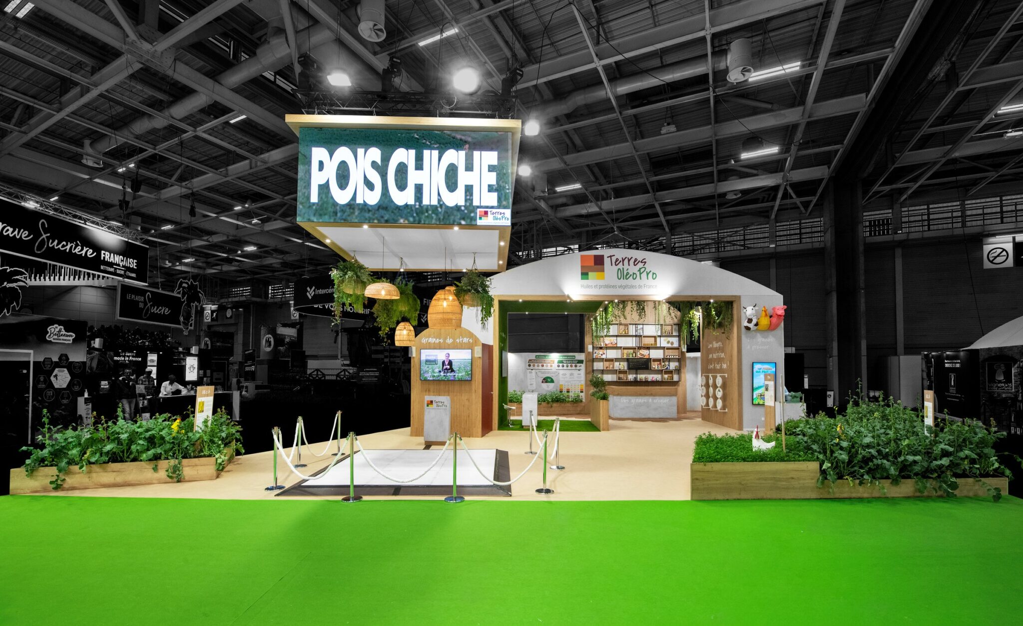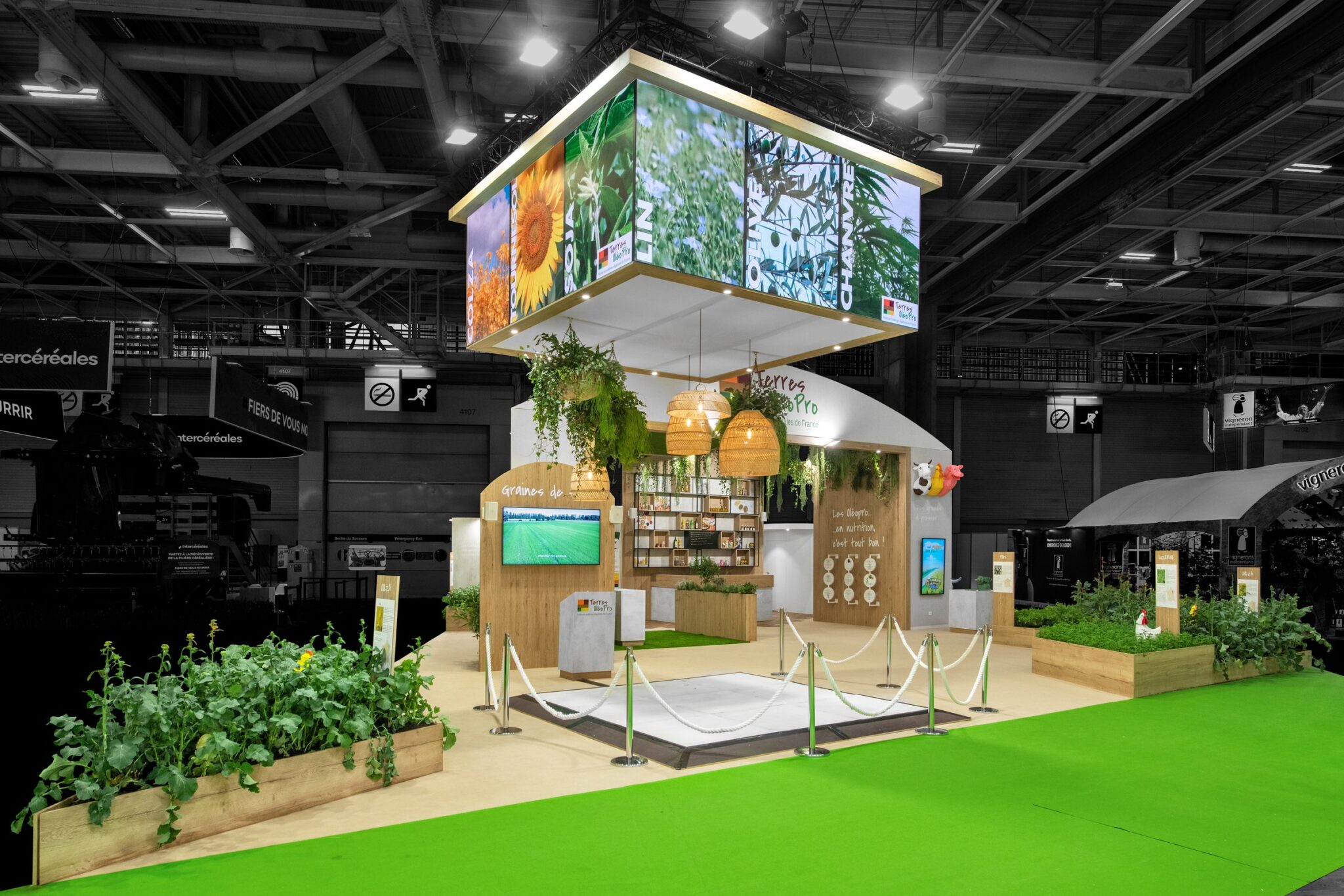 Among our flagship projects, the booth for our long-standing client, Terres OléoPro, stood out. Spanning 255 m², this space is designed as a genuine hub for discovery and interaction.
