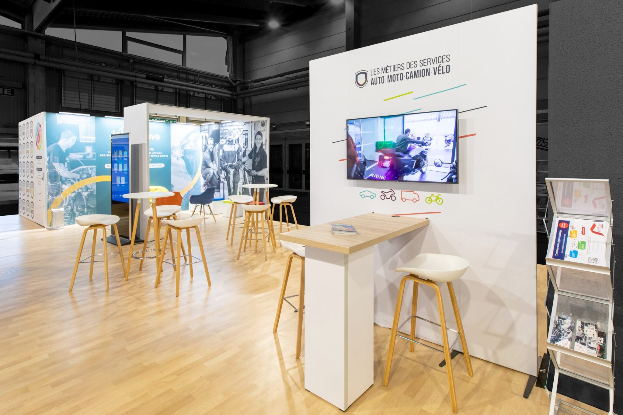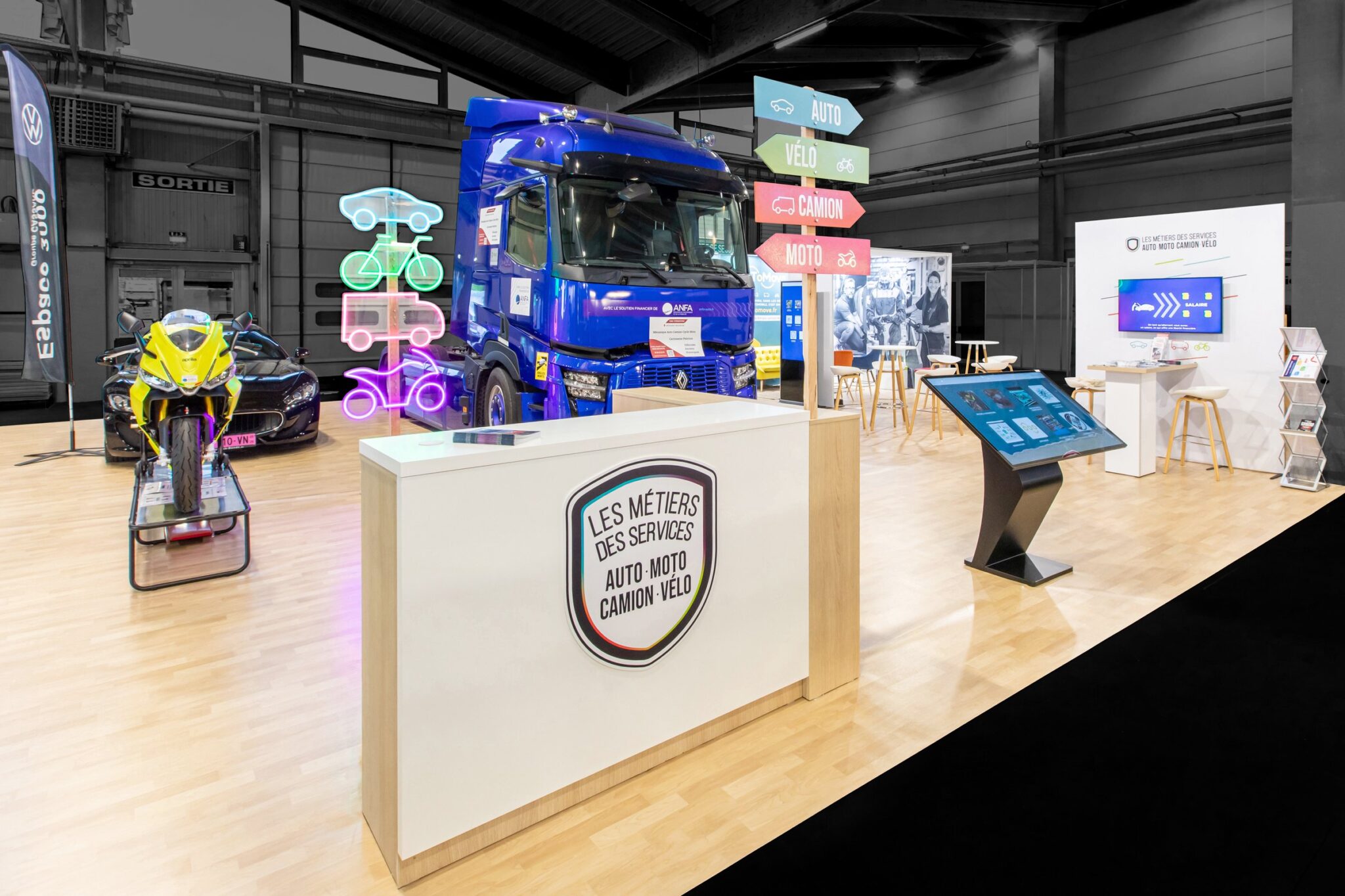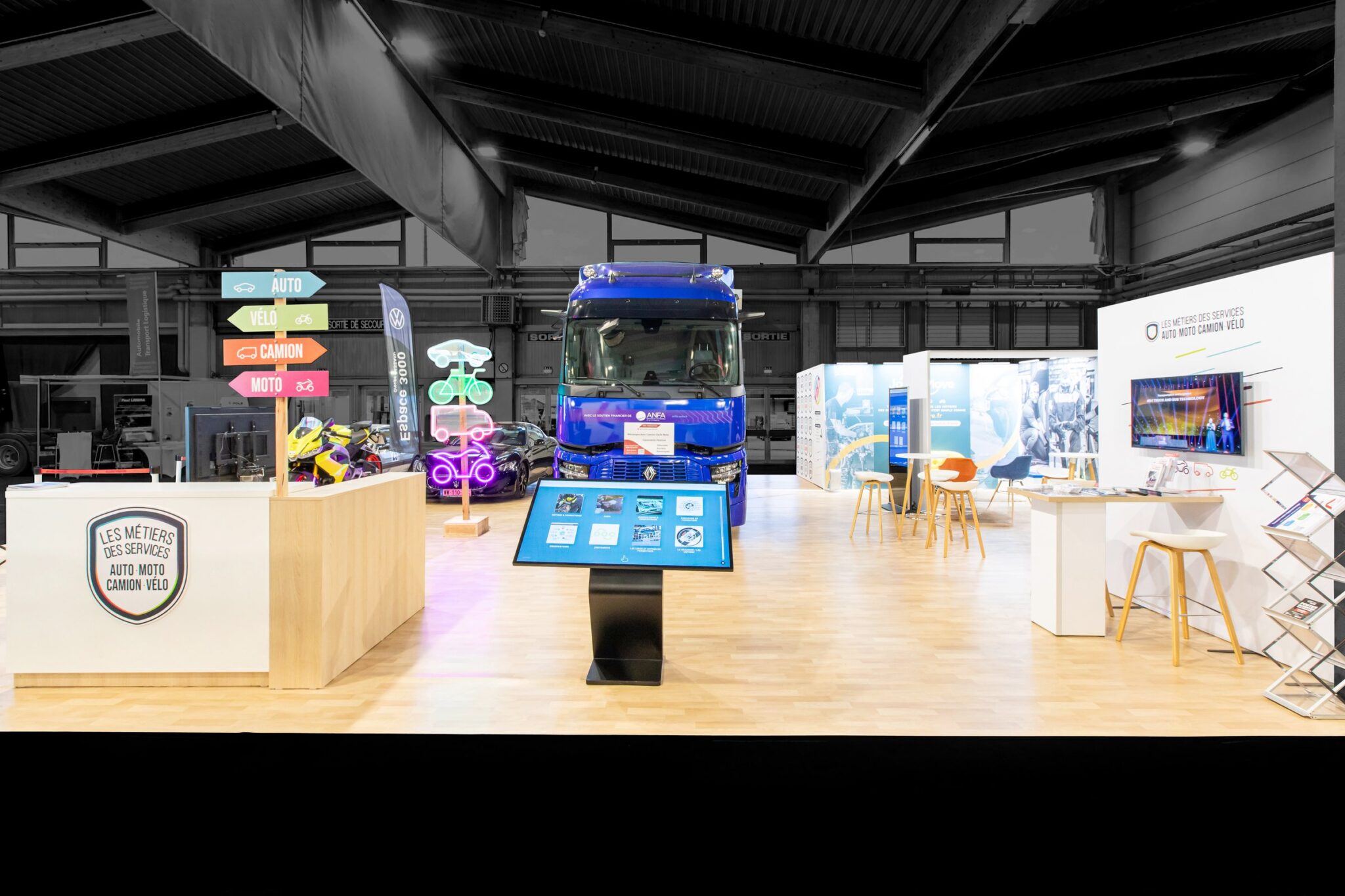 Dynamism and immersion: the main objective is to create a dynamic and attractive space to welcome middle school students, spark their curiosity, and introduce them to all the training programs available. The inclusion of vehicles on display reinforces the visual impact, offering a concrete immersion in the automotive and service professions.