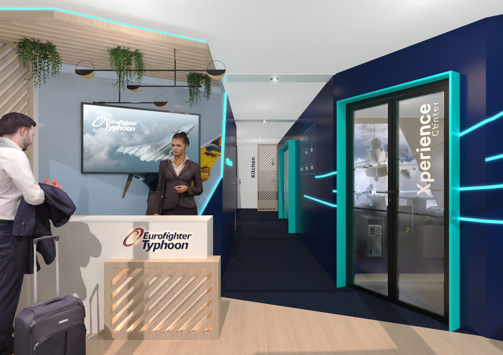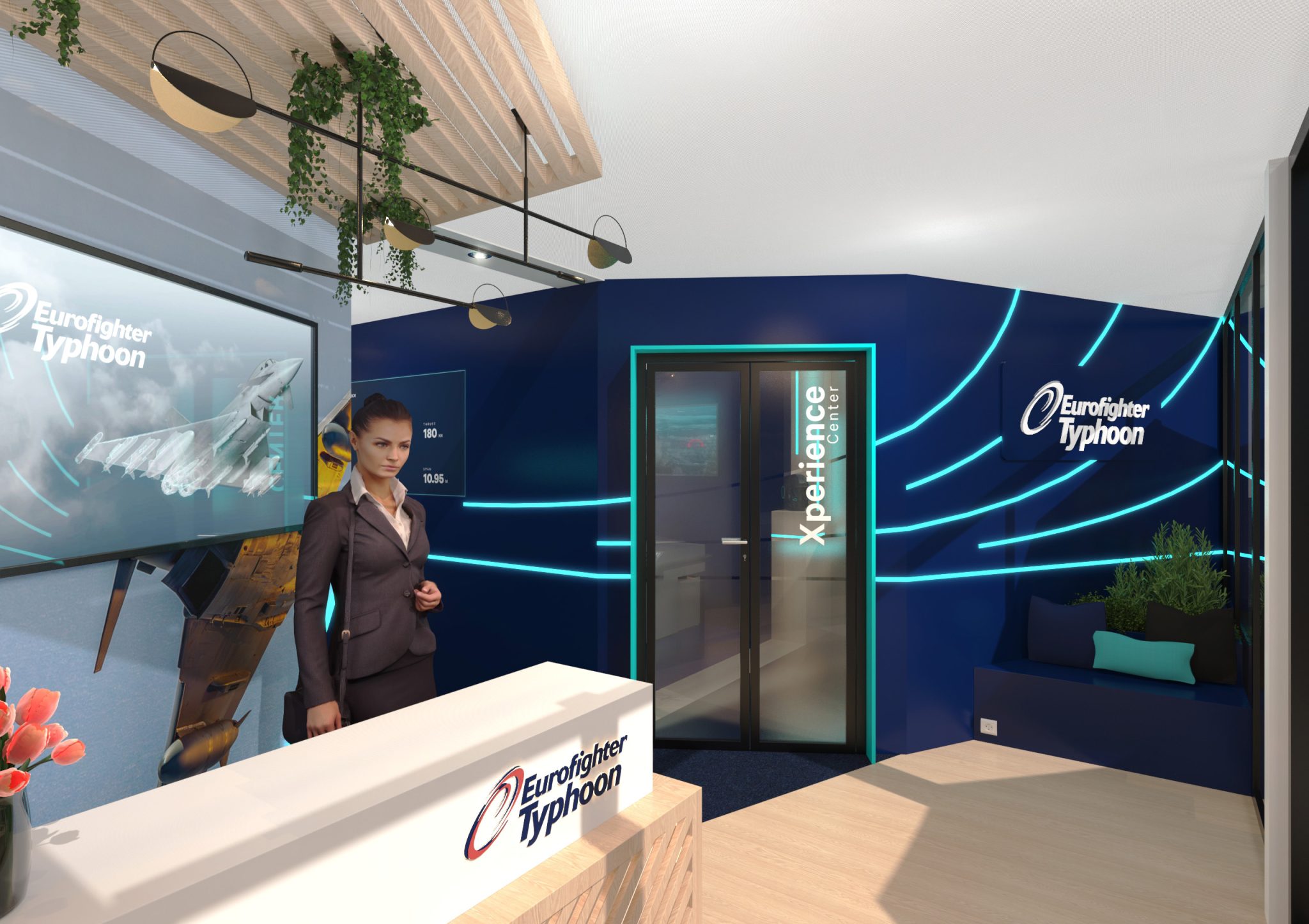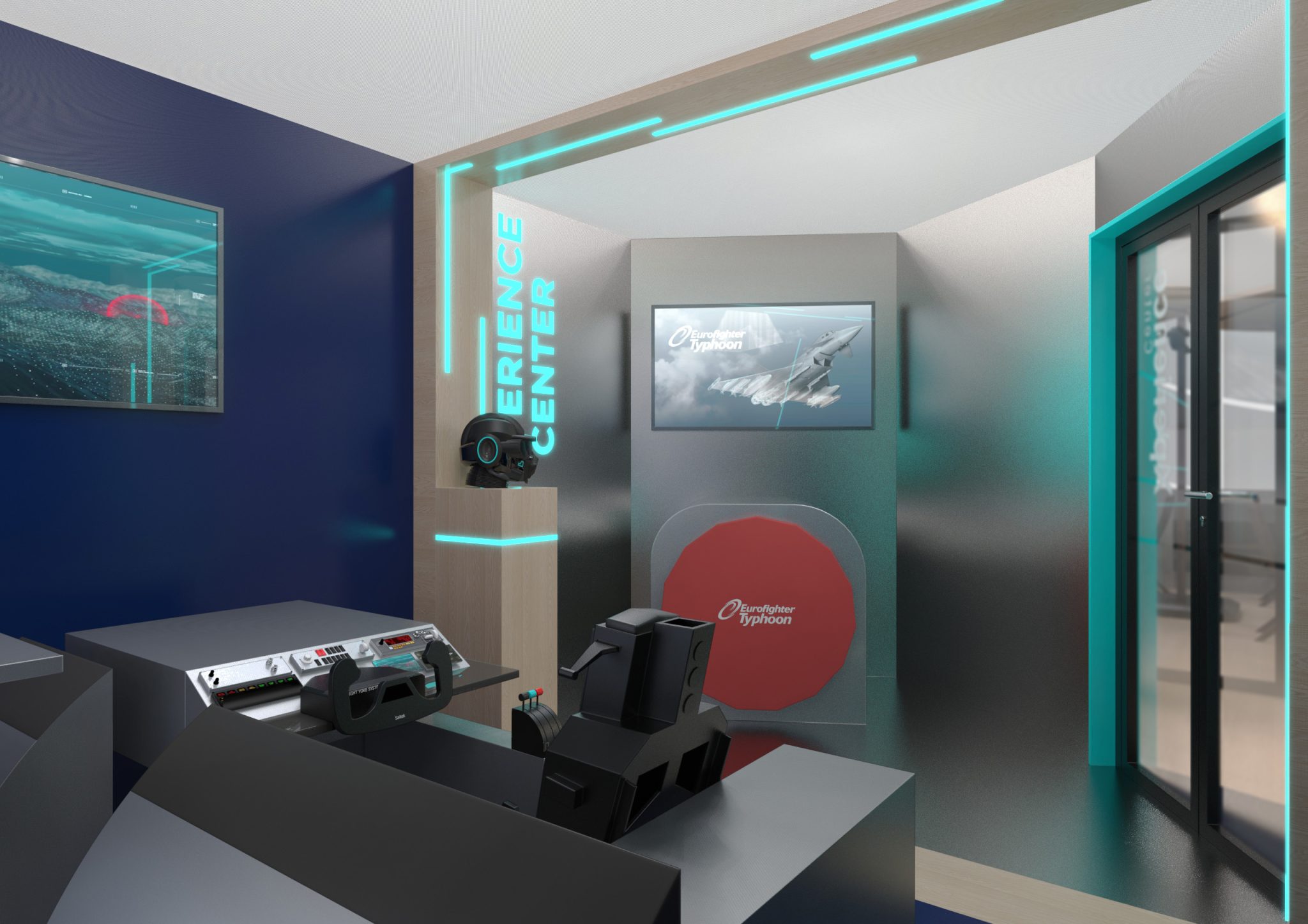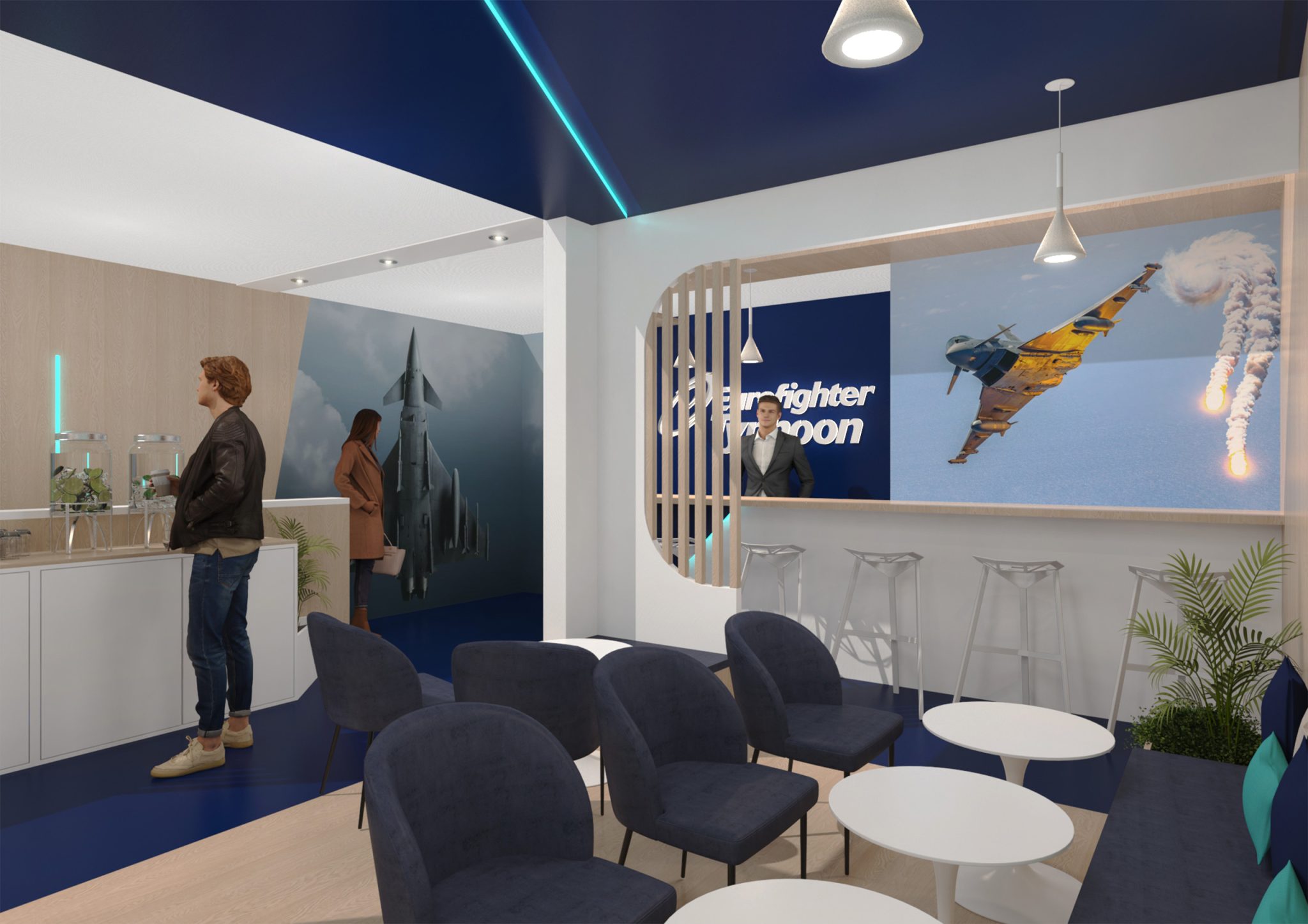 On the back wall, a 55″ LED screen displays Eurofighter’s institutional videos.