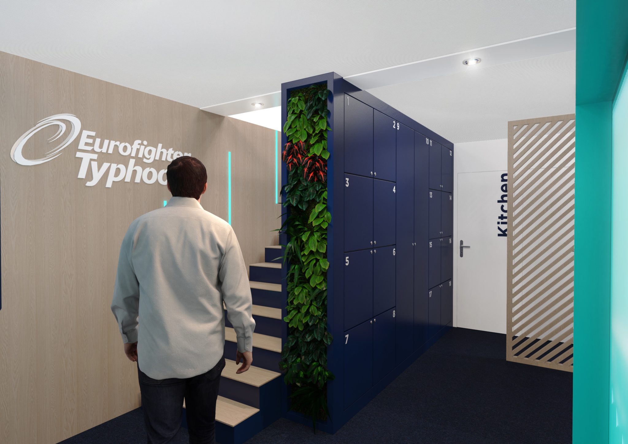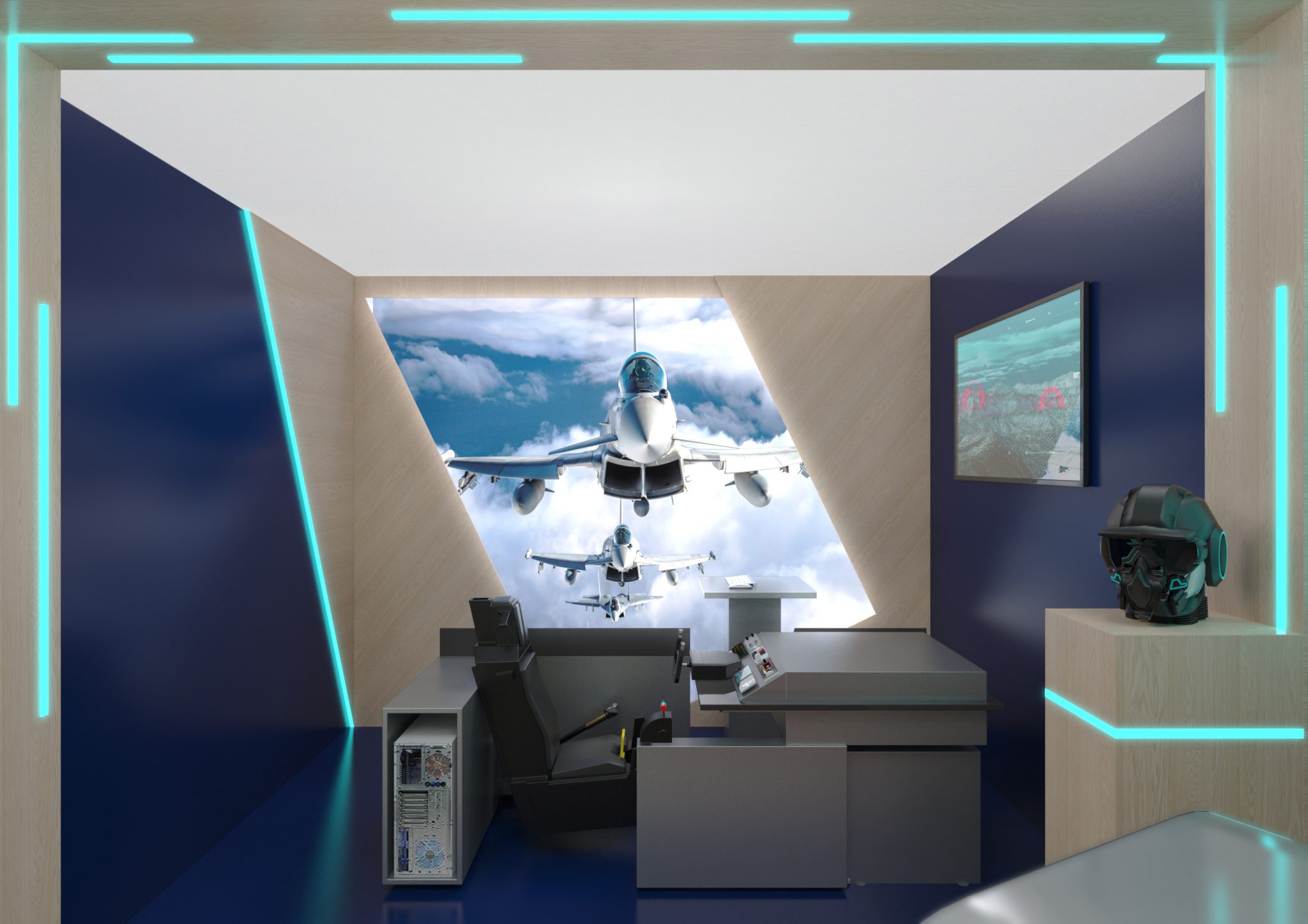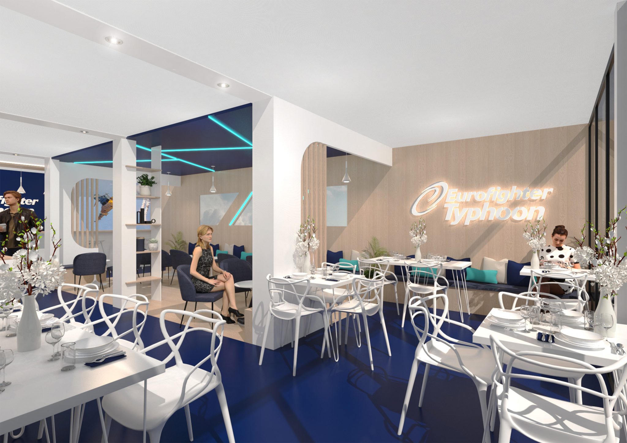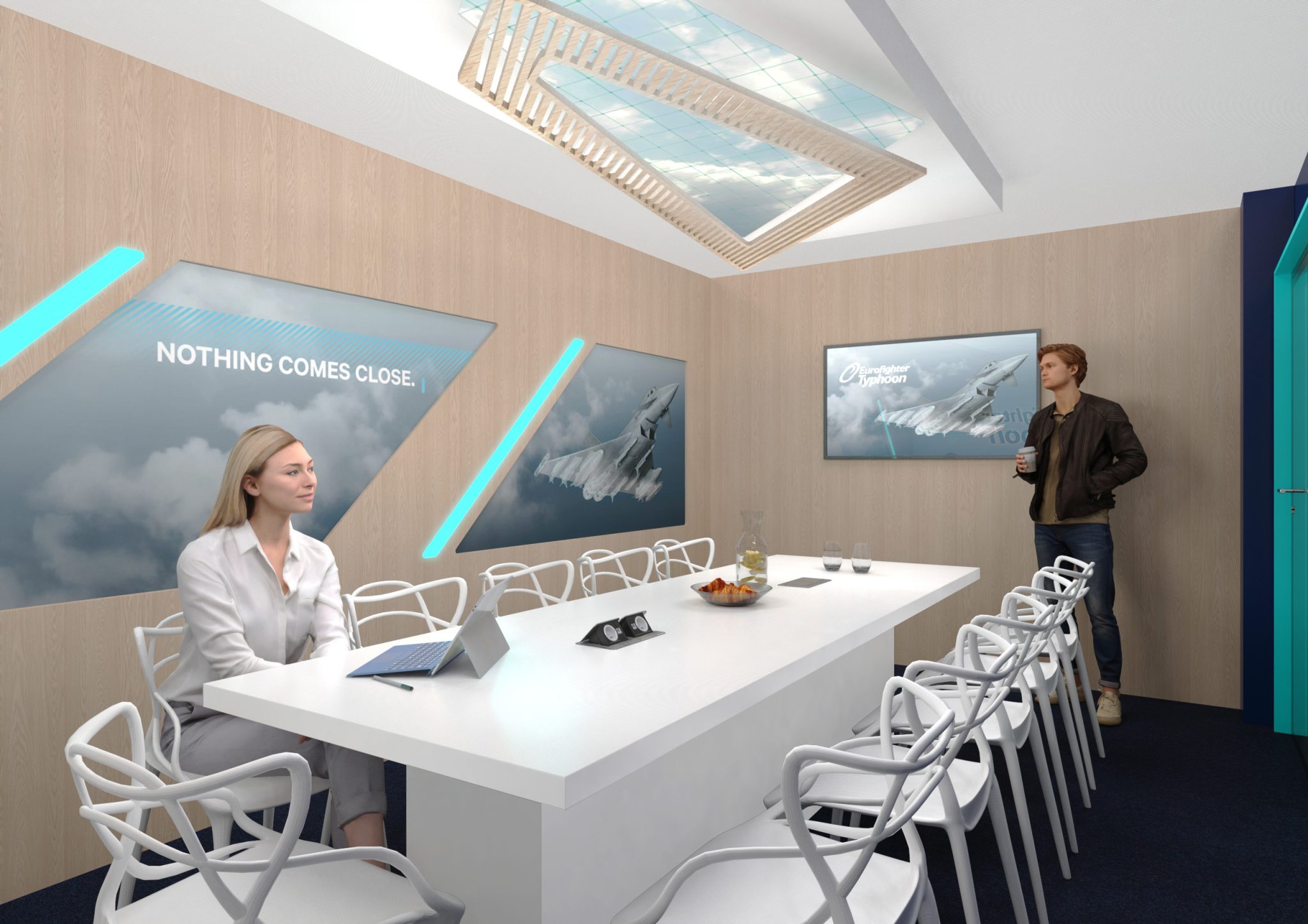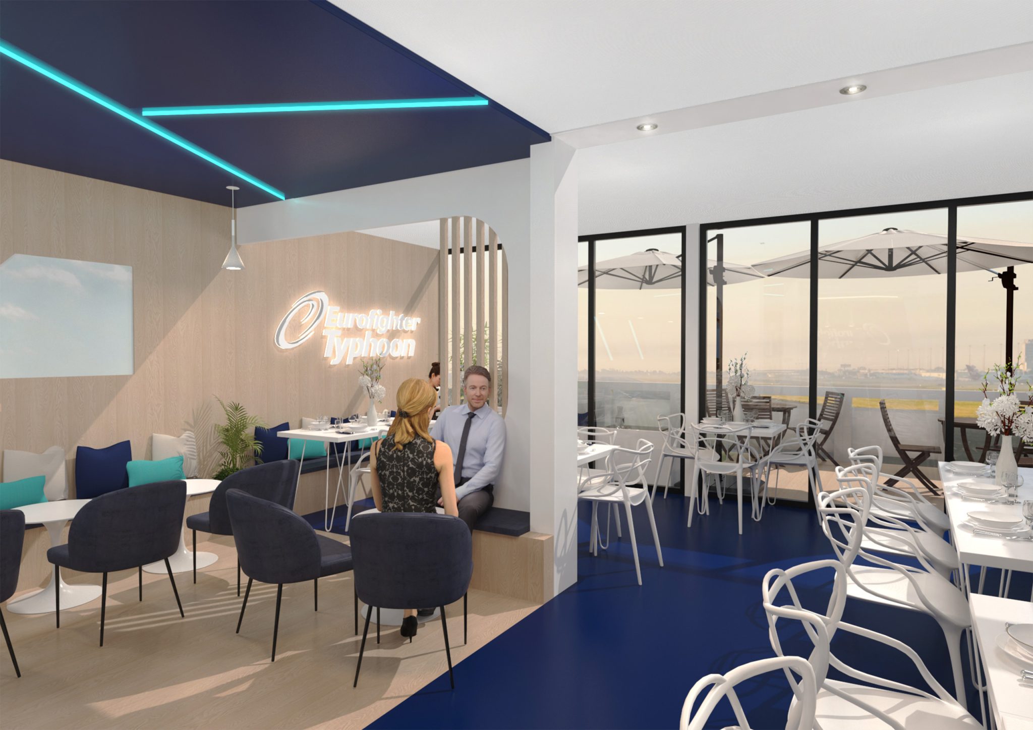 On the back wall, a 55″ LED screen displays Eurofighter’s institutional videos.
