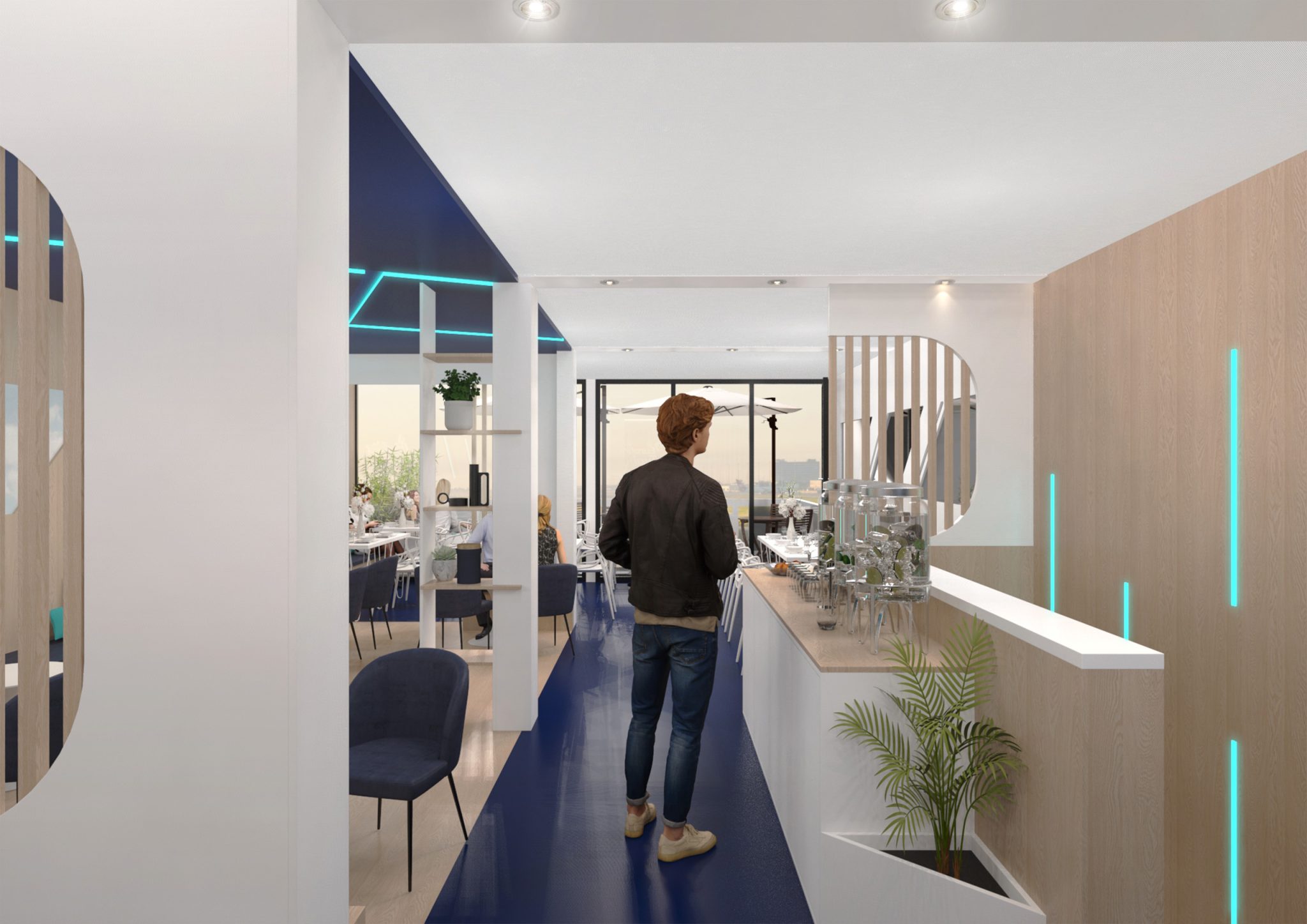 Designed as a genuine space for meeting and customer relations, this concept features a welcoming lounge and three restaurant-style areas that can accommodate up to 12 guests. The whole space opens onto a large glass façade, symbolizing transparency and visibility.