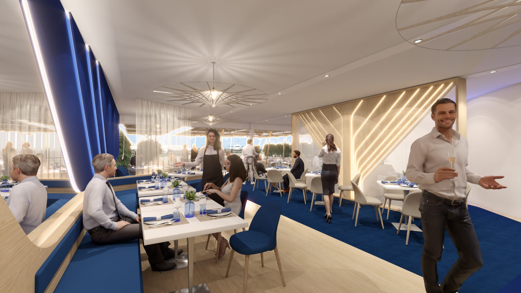 On the right, the Business Zone includes a cloakroom, lounge, and meeting rooms.
