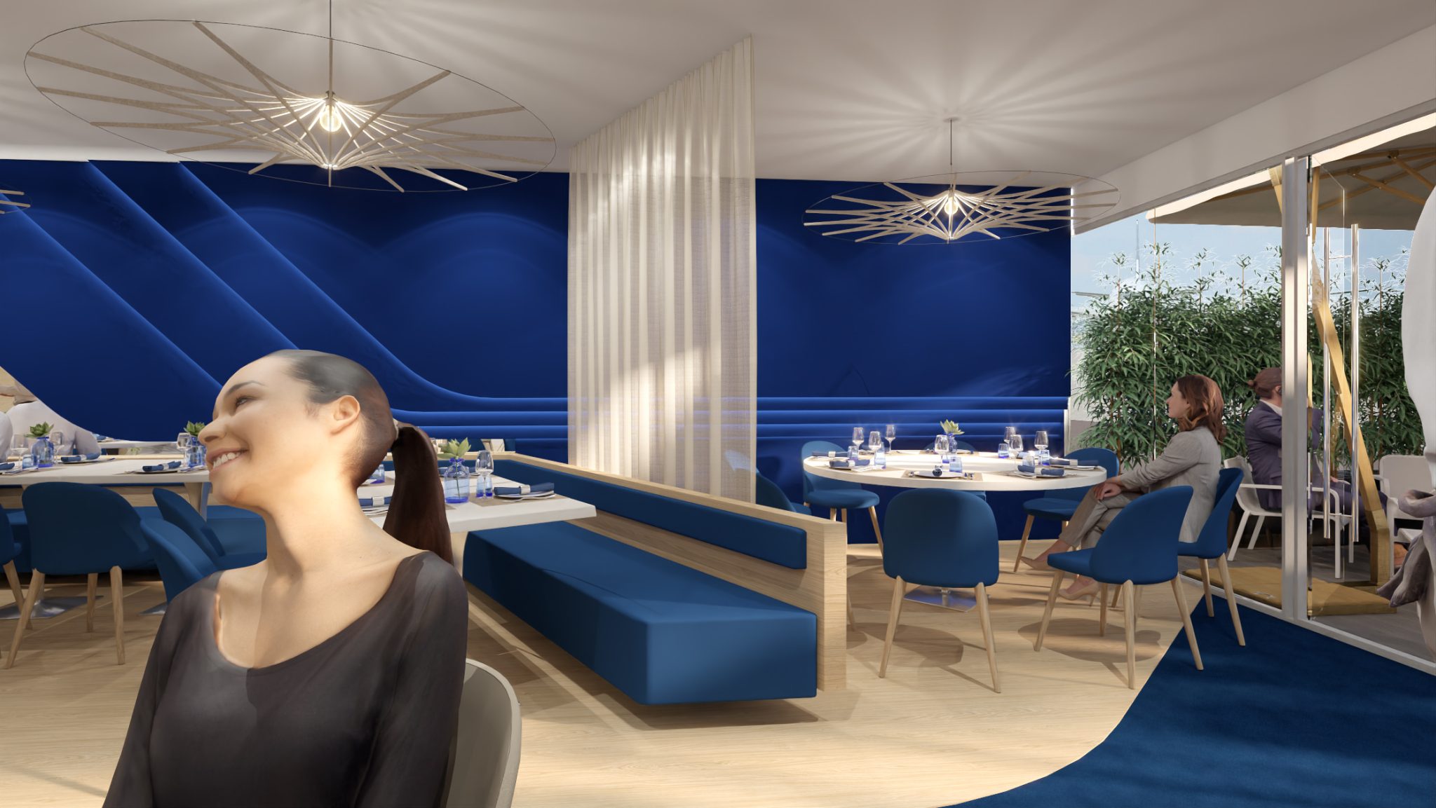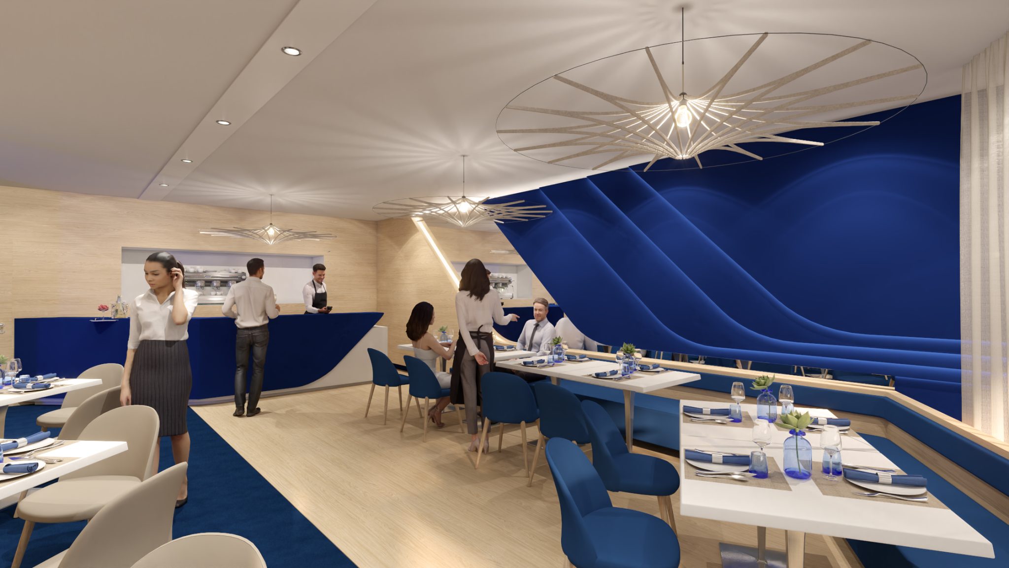 The central bar, with its blue and white design, combines aesthetics and functionality: its 4 linear meters of fully equipped counter space allow for smooth service while ensuring visual contact throughout the restaurant. The dining area offers 45 seats in a warm and welcoming setting.