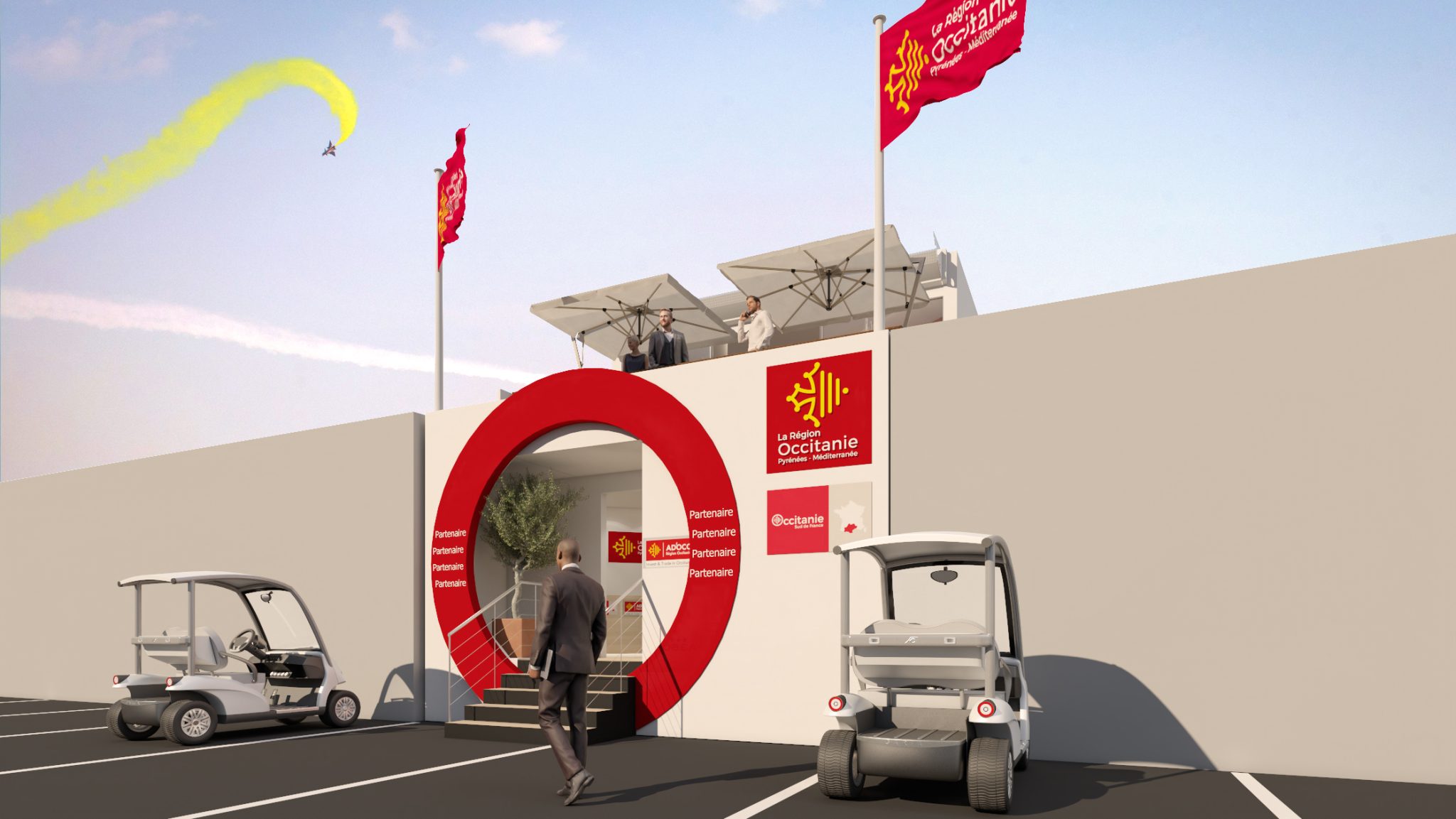 As soon as they arrive, visitors are greeted by an open, bright entrance, punctuated by Occitanie flags that frame the space and affirm the region’s presence.