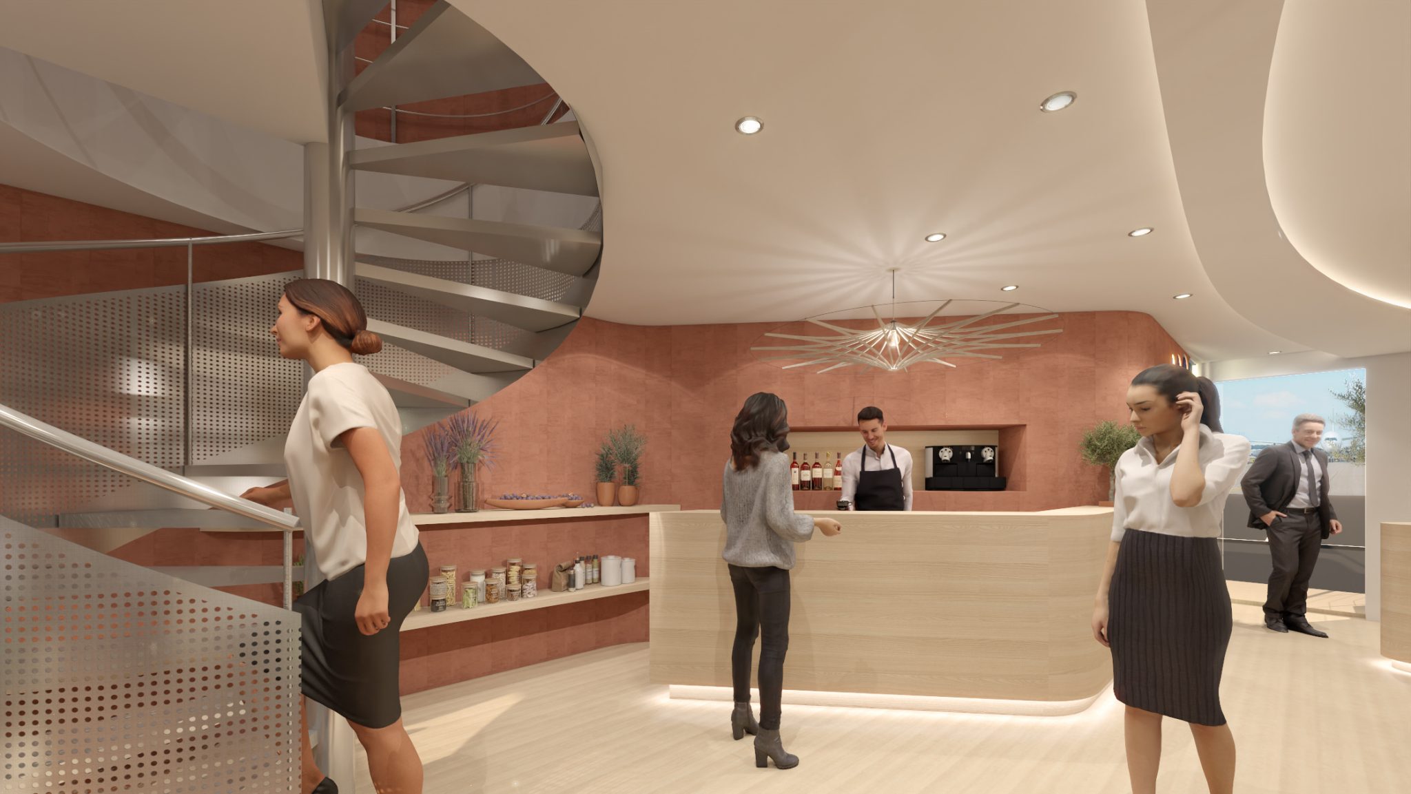 The wooden reception desk, both structural and welcoming, allows for smooth access control and guides visitors to the different areas.