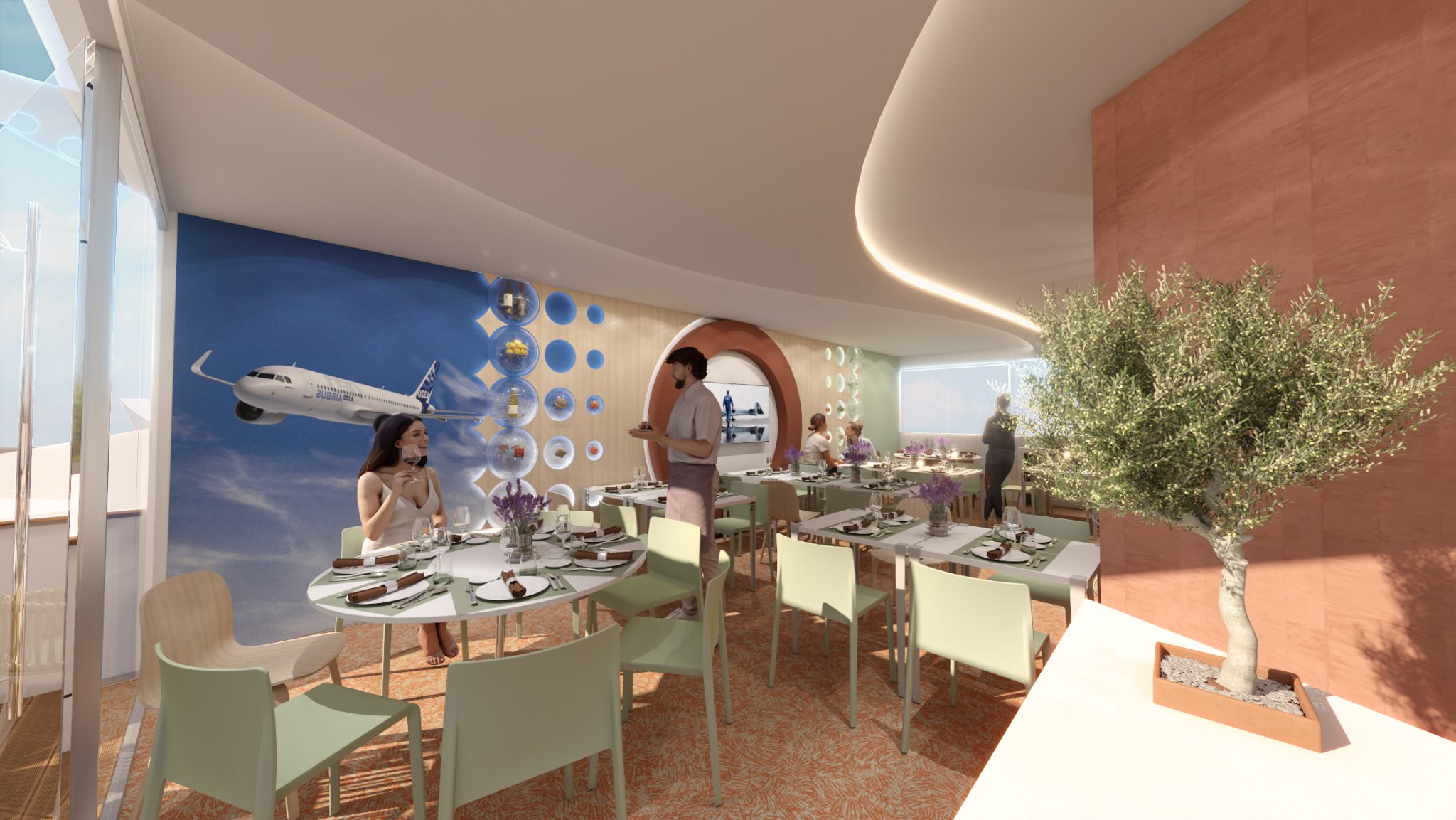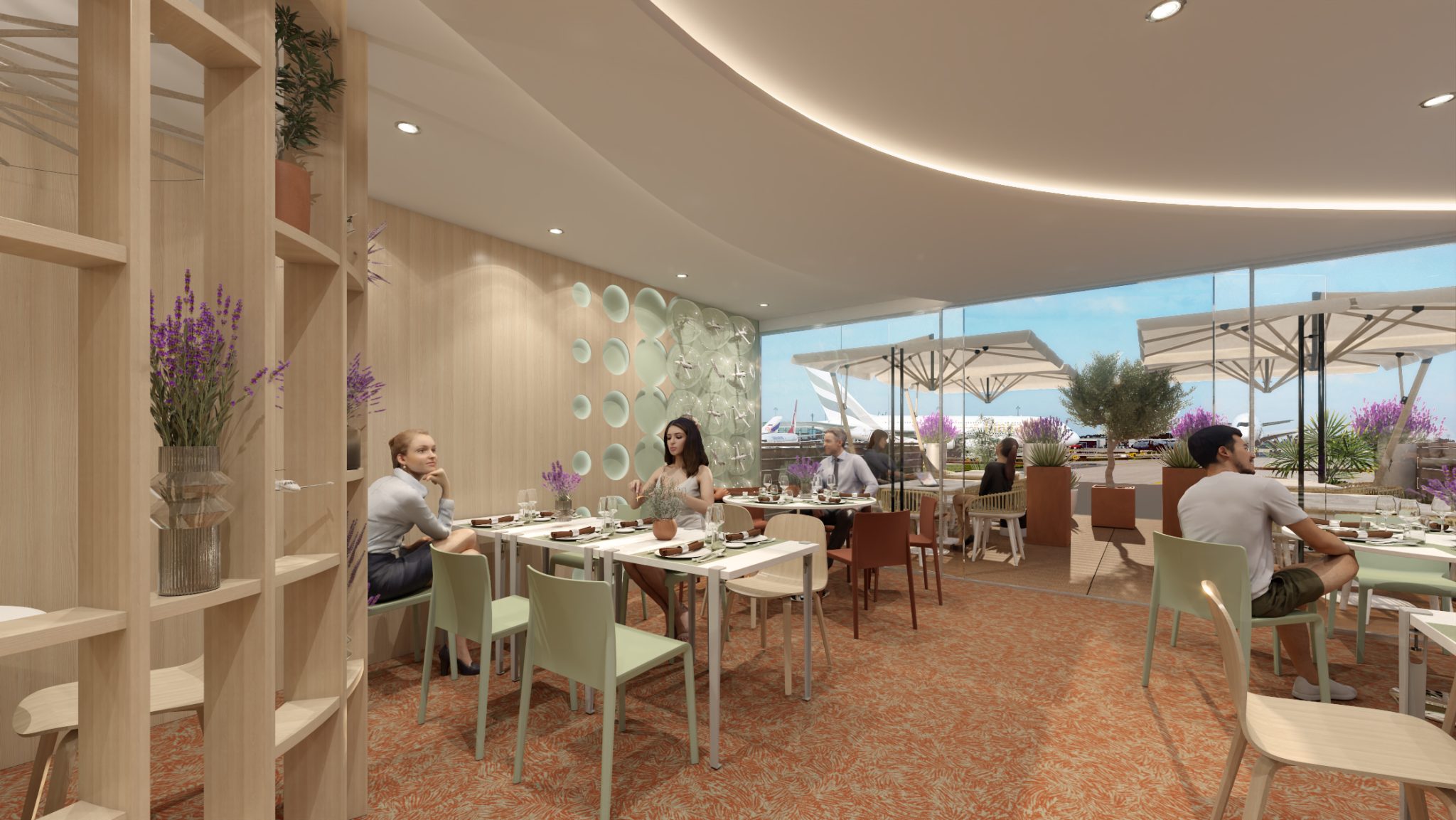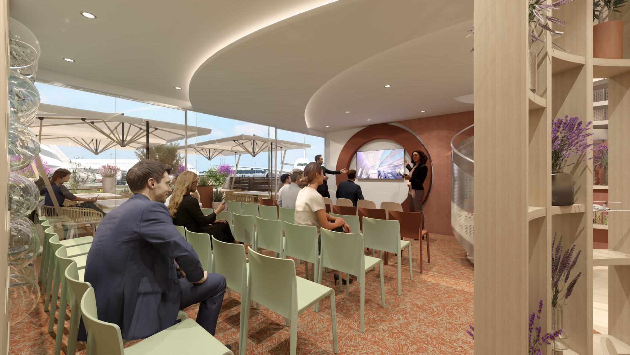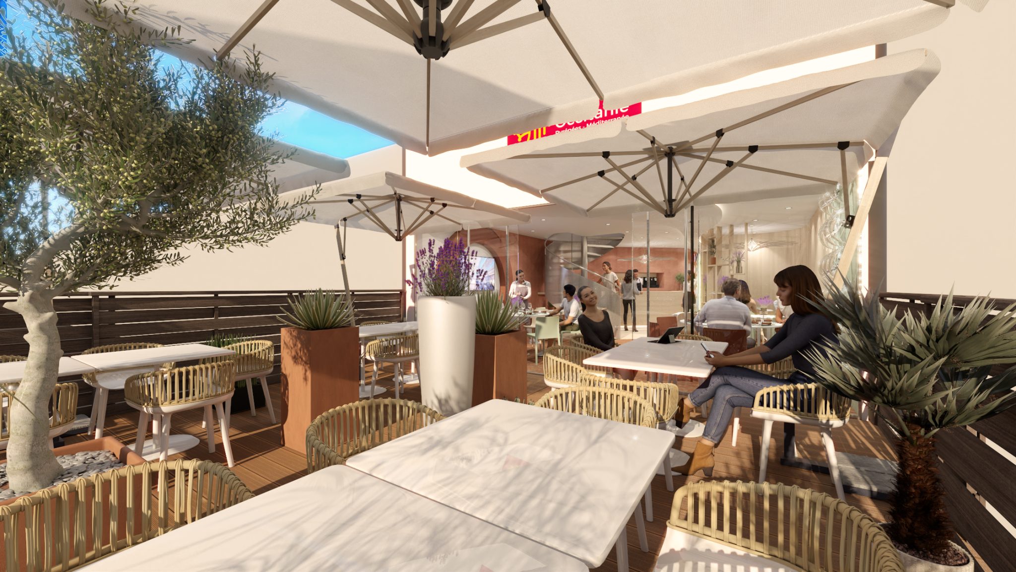 A wooden alcove decorated with lavender, mini olive trees, and aromatic plants evokes the South of France and creates the perfect cocoon for confidential meetings or interviews.