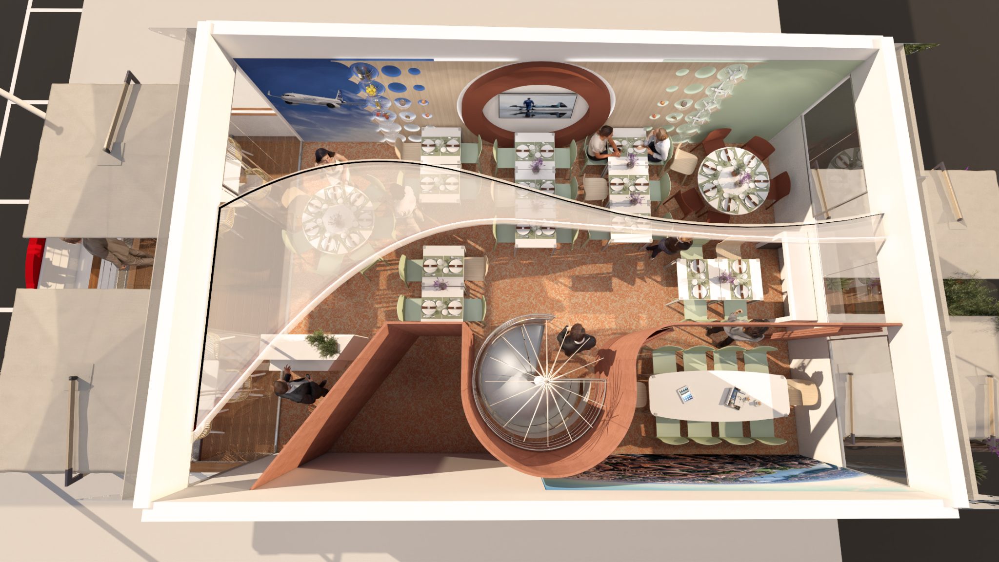 A bar/buffet, a private meeting room for 8 people equipped with a 55″ screen, and an 18 m² balcony for 12 guests, offering a breathtaking view of the lounge.
