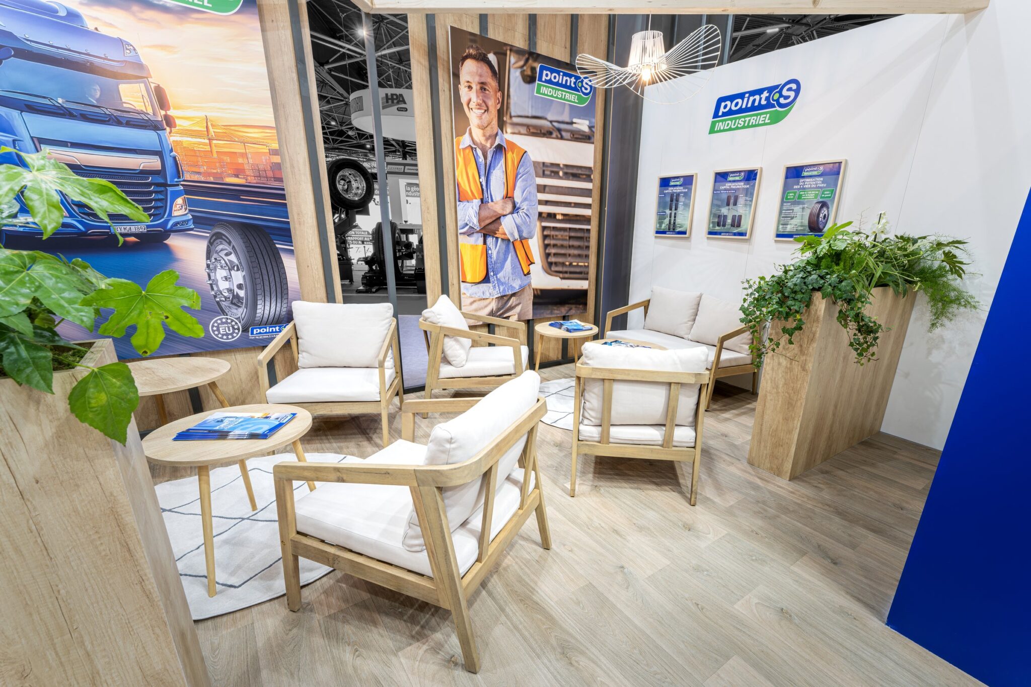 Au cœur du stand, un espace de discussion central est aménagé, à proximité de la banque d’accueil, facilitant les échanges commerciaux et l’orientation des visiteurs dès leur arrivée.