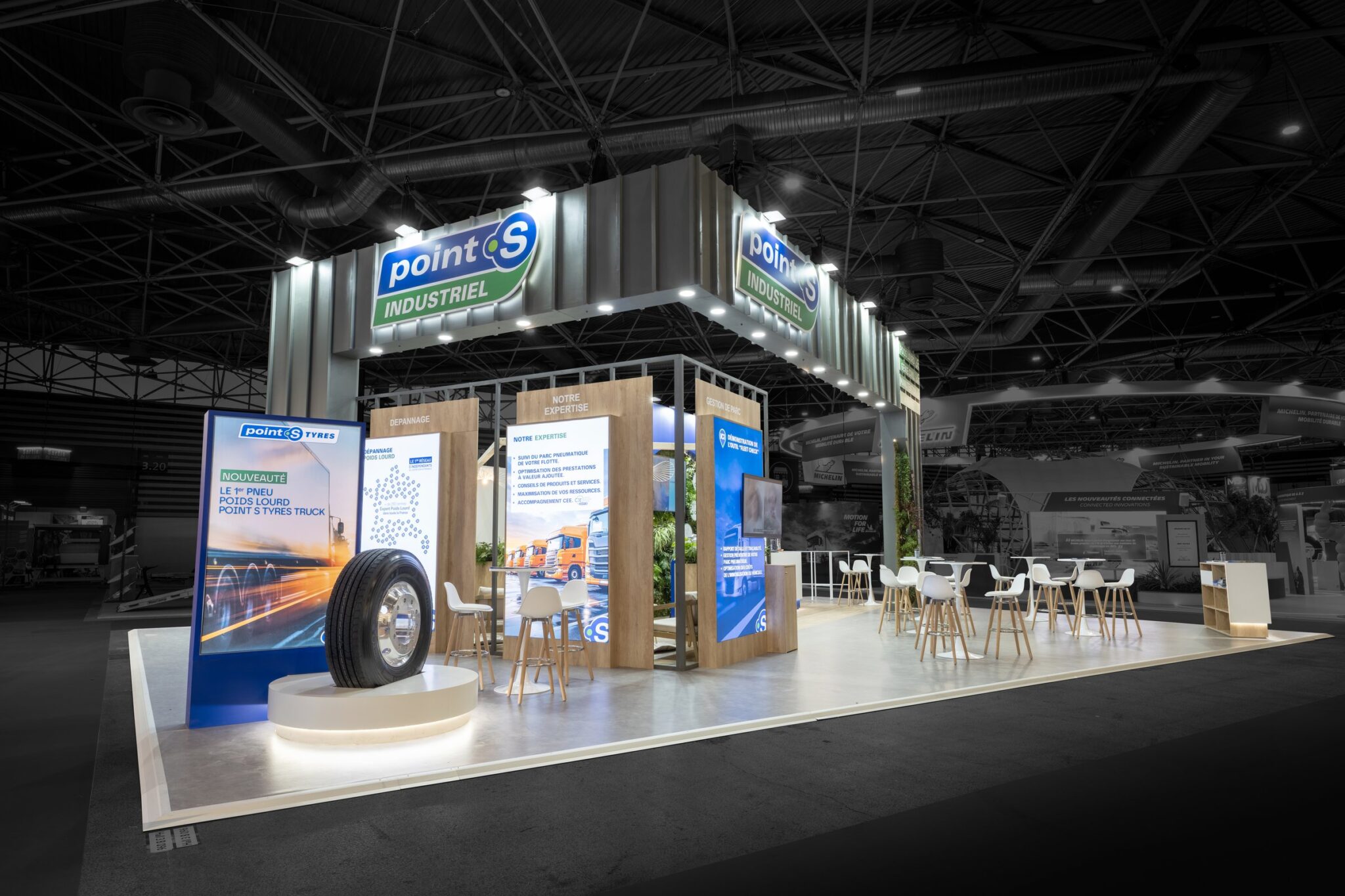 Sur une surface de 140 m², R2 Stand & Event réalise un stand reprenant avec précision la charte graphique Point S d’un centre auto. Le design s’inspire notamment de la forme emblématique du bardage, assurant une reconnaissance immédiate de la marque et une cohérence forte avec son univers retail.