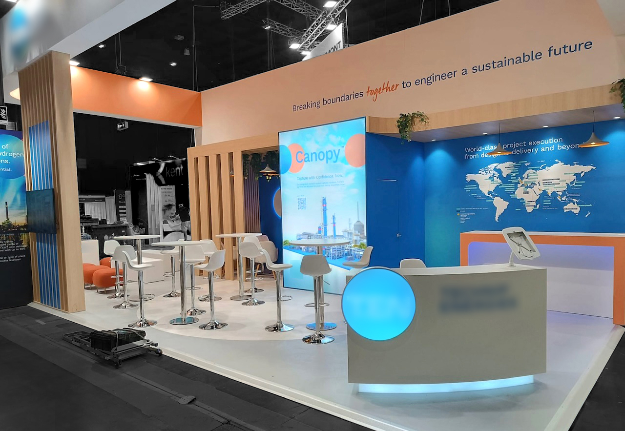 Le stand se distingue par un rendu premium et harmonieux, résultat de l’alliance de matériaux de haute qualité et d’éléments lumineux de manière subtile. Technip Energies se dévoile avec éclat et assurance par le biais d’une trichromie blanc, bleu et corail, créant une harmonie visuelle qui reflète parfaitement l’identité de la marque.